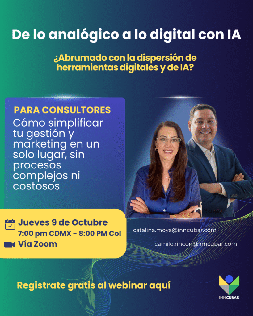 Por favor, deja este campo vacíoInscripción al webinar ¨De lo Analógico a lo Digital con IA" ¿Abrumado con la dispersión de herramientas digitales y de IA? Si eres consultor, seguro te suena familiar: una app para tus clientes, otra para tu agenda, otra para tu marketing… y al final terminas con más caos que productividad. Por eso creamos el webinar gratuito: “De lo Analógico a lo Digital con IA” En este espacio descubrirás cómo simplificar tu gestión y marketing en un solo lugar, sin procesos complejos ni inversiones costosas. Jueves 9 de Octubre 7:00 pm (CDMX) | 8:00 pm (Colombia) Vía Zoom "La digitalización es como el ejercicio: todos sabemos que deberíamos hacer más, pero siempre lo posponemos para 'mañana'." No dejes que la tecnología te abrume, aprende a usarla para hacer crecer tu negocio. Regístra tus datos aquí y antes del evento te enviaremos el enlace de ZOOM. Acepto Aviso de Privacidad Acepto Términos y Condiciones Recibirás en tu email un mensaje para que CONFIRMES tu aceptación a la inscripción de esta lista. Revisa en tu bandeja de promociones o SPAM. Lee nuestro Aviso de privacidad y Términos y Condiciones para obtener más información. Revisa tu bandeja de entrada o la carpeta de spam para confirmar tu inscripción.